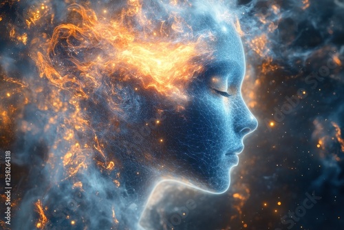 Fiery cosmic woman profile, nebula background, spiritual art, design