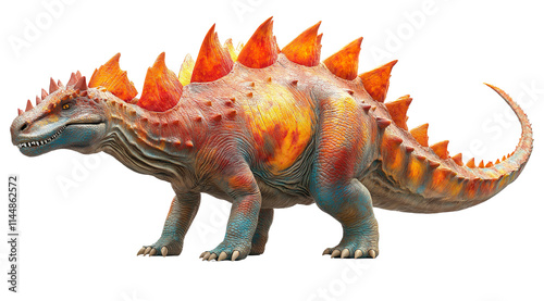 Fiery Dino: A majestic, fiery dinosaur, digitally rendered in vibrant orange and blue hues, displays impressive spikes along its back.