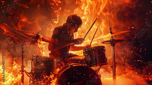 Fiery Drummer Performance Intense Passionate Concert Stage Live Music Flames
