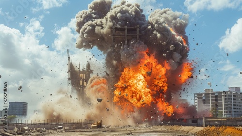 Fiery explosion at a construction site, sending smoke and debris into the air.