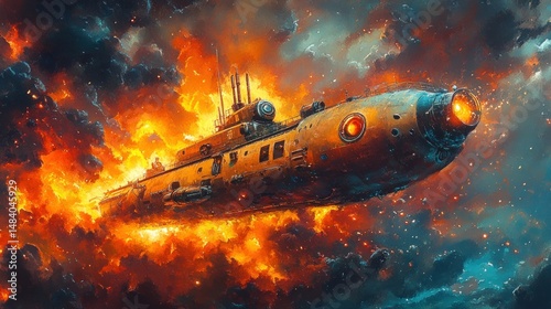 Fiery, futuristic submarine hurtling through a stormy, explosive cosmos