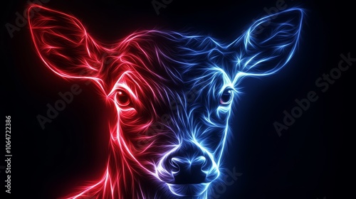 Fiery ghost deer with glowing eyes, neon highlights in blue and red, ethereal and mystical