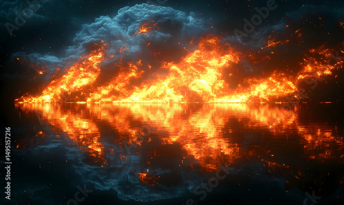 Fiery inferno reflects on still water under a night sky, creating an ethereal scene