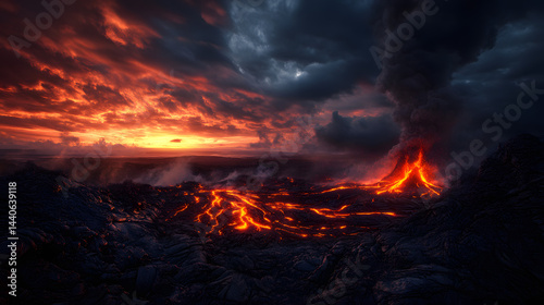 Fiery lava eruption under a dark sky with a glowing horizon in the distance.