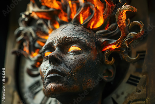 Fiery Medusa Head Sculpture with Glowing Eyes and Clock Background – Fantasy Mythological Artwork