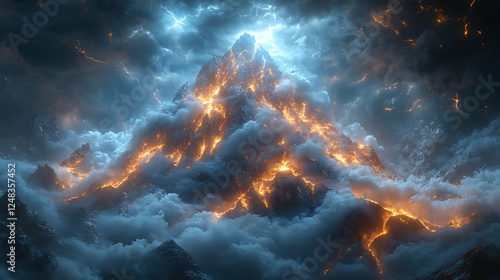 Fiery mountain peak erupts, cloudscape backdrop, fantasy art