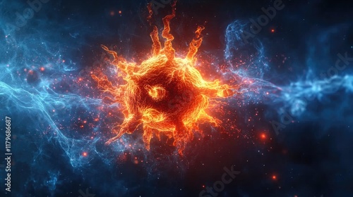 Fiery nebula explosion amidst blue cosmic clouds in deep space. hMPV, Human metapneumovirus