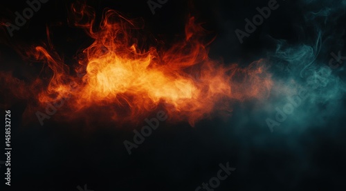 Fiery orange and teal smoke against a dark background. Swirling, dynamic, abstract, and dramatic visuals