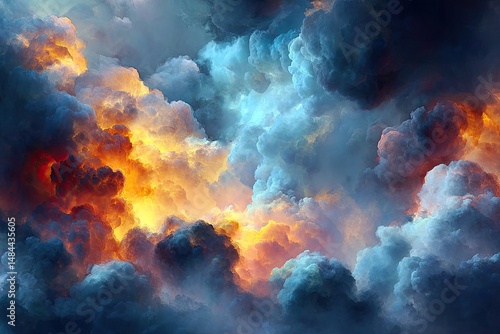Fiery orange clouds meet serene blue in surreal landscape