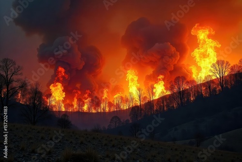Fiery orange flames engulf a dry forest, smoke billowing into the smoky sky The intense heat and destruction are clearly visible in this dramatic shot of a raging wildfire , orange, ash, nature