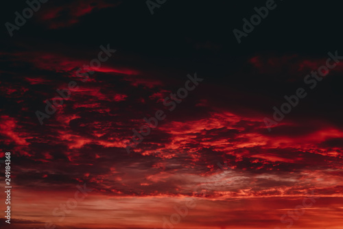 Fiery red blood vampire dawn. Amazing warm dramatic fire cloudy sky. Vivid orange sunlight. Atmospheric background of sunrise in overcast weather. Hard cloudiness. Storm clouds warning. Copy space.