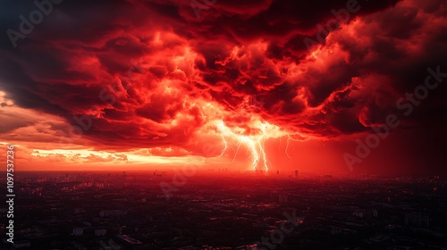 Fiery red storm clouds above a blackened city with light rays cutting through the dark, explosive visuals,