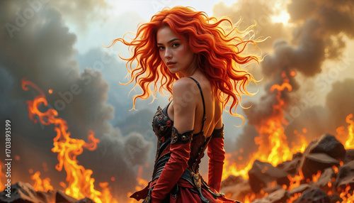 Fiery Redhead Warrior Woman: Dramatic Fantasy Portrait, Epic Battle Scene, Intense Gaze.