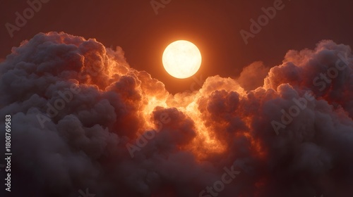 Fiery sun emerges from dense smoke clouds a dramatic atmospheric inferno
