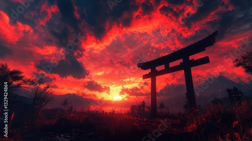 Fiery sunset illuminates Japanese torii gate, mountain backdrop, serene landscape
