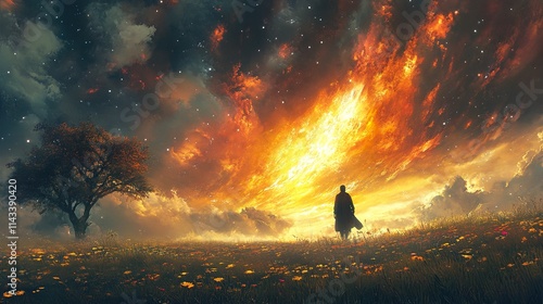 Fiery Sunset Landscape: A Solitary Figure in a Dreamlike Field