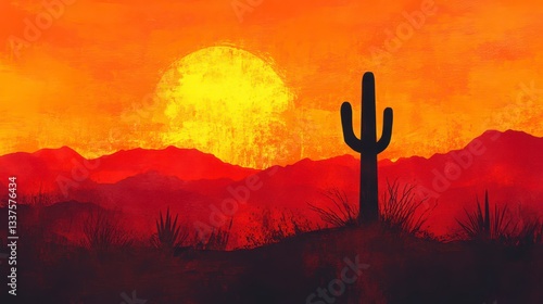 Fiery Sunset over Sonoran Desert Landscape with Saguaro Cactus Silhouette