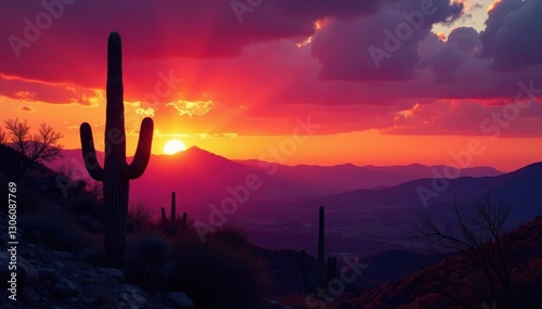 Fiery sunset paints Arizona mountains, silhouetted saguaro cacti , evening, mountains