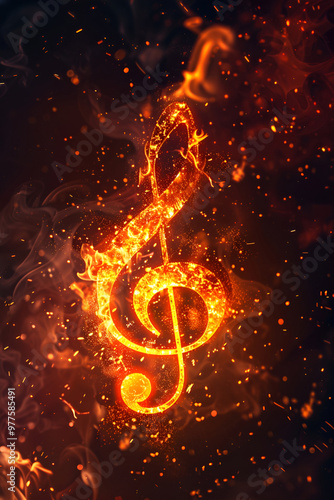 Fiery treble clef symbol engulfed in glowing flames with a dynamic, intense energy, International Music Day