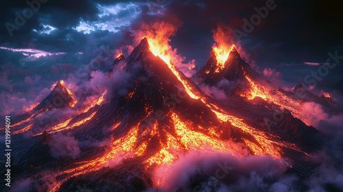 Fiery Volcanic Eruption: A Breathtaking Night Landscape of Glowing Magma and Dramatic Clouds