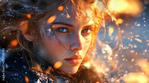 Fiery-haired woman in an ice field, contrasting warmth and chill, vibrant colors, dynamic scene, mystical atmosphere, striking visual impact