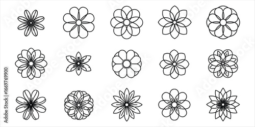 Fifteen black outline floral patterns and flower designs on white background vector illustration