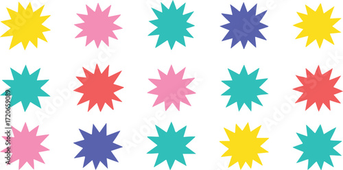 Fifteen colorful starburst shapes arranged in three rows on a white background explosion
