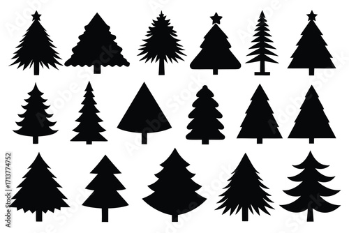 Fifteen Different Christmas Tree Silhouettes with Varied Shapes and Styles on White Background