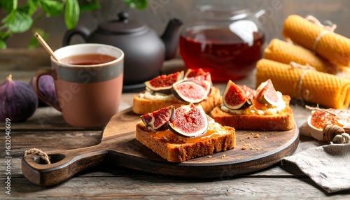 Fig Toasts with Tea and Honeycomb on Rustic Wooden Board, Cozy Still Life