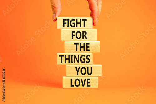 Fight for love symbol. Concept words Fight for the things you love on wooden blocks on a beautiful orange table orange background. Businessman hand. Business motivational and fight for love concept.