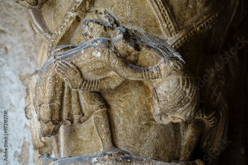 Fight Romanesque capital, monastery of San Cugat del Vallés cloister, San Cugat del Vallés, Barcelona, Catalonia, Spain