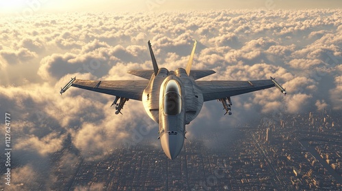 Fighter Jet Soaring Above City Cloudscape Sunset