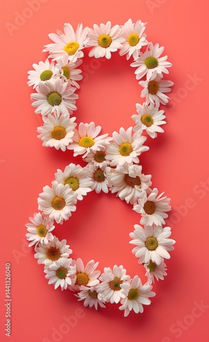 figure eight shape made of white daisies with yellow centers on a coral background conveying freshness and natural beauty