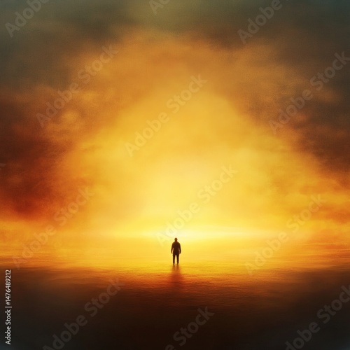 Figure standing in glowing landscape, silhouette in distance, warm color palette, adventure, surreal environment, exploring