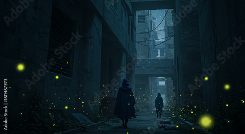 Figures in an Alley A Mysterious Encounter Amidst Glowing Insects and Urban Decay