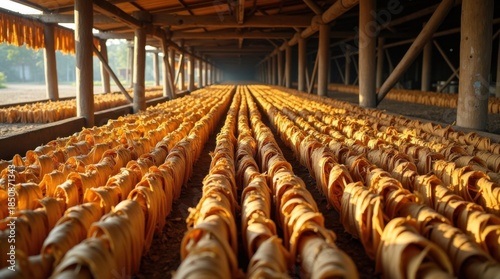 Filas de hojas de tabaco secándose lentamente sobre postes de madera horizontales desgastados