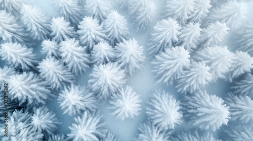 冬季落满雪花的松树林俯拍图