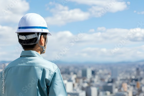 男性、ヘルメット、後ろ姿、建設事業、電気設備事業、青空、コピースペース