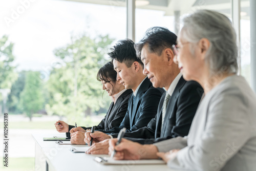 セミナー・講習会を受講するスーツ姿のビジネスマン男女