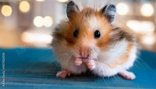 小さなハムスターが自分の体を一生懸命毛づくろいしている。前足で顔をこすり、毛をなめたり、体全体を整えたりする動きが可愛らしく、清潔さを保つために真剣な様子が微笑ましい