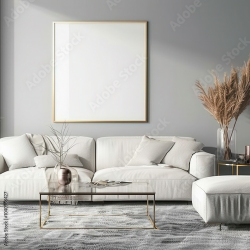 「白いソファ、スタイリッシュなインテリア、モックアップの額縁をあしらったモダンなリビングルームインテリア。アート作品やデザインの展示に最適です。」