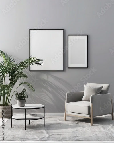 「モダンでミニマルなリビングルームインテリア。快適なアームチェア、コーヒーテーブル、スタイリッシュなウォールフレーム。アート作品やデザインコンセプトの展示に最適」