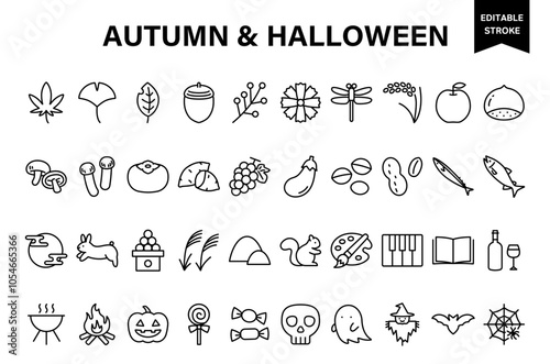 シンプルな線画の秋とハロウィンのベクターアイコンセット
