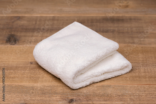 木のテーブルに置かれた白いフェイスタオル