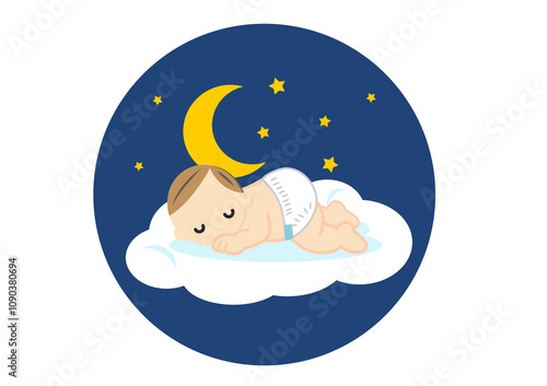 睡眠、寝る、リラックス、イラスト、眠り、人物、かわいい、健康、眠る、子供、ねむり、寝、挿絵、赤ちゃん、赤ん坊、乳児、キッズ、ベビー、雲、空、夜、夜空、快眠、子ども、こども、月、おむつ、オムツ、枠なし