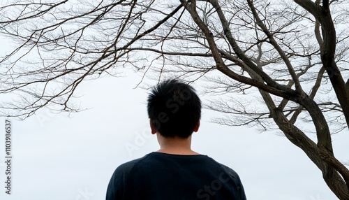 겨울철 나뭇잎이 없는 가지 아래 혼자 서 있는 사람의 실루엣