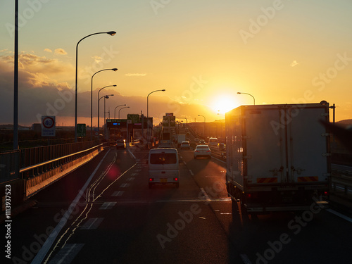 日本の夕方の高速道路の車の列と綺麗な夕日の風景