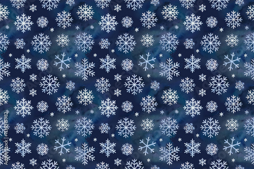 水彩画の雪の結晶のシームレスパターン、ネイビーの背景