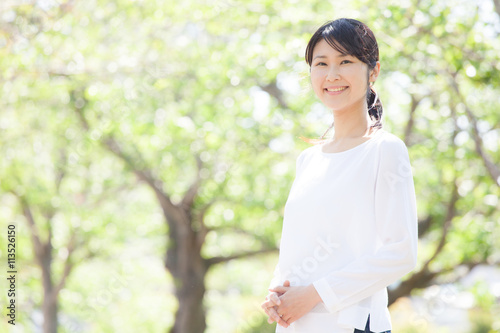笑顔の女性、新緑