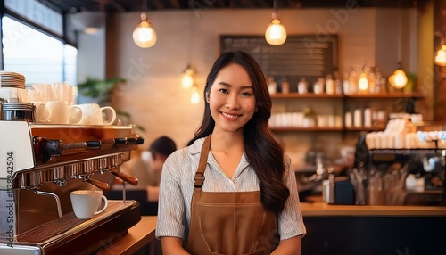 穏やかな笑顔の若い女性バリスタとカフェの心地よい雰囲気